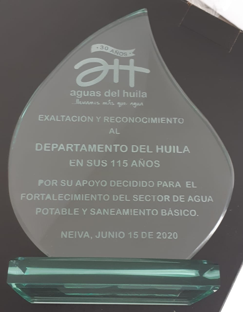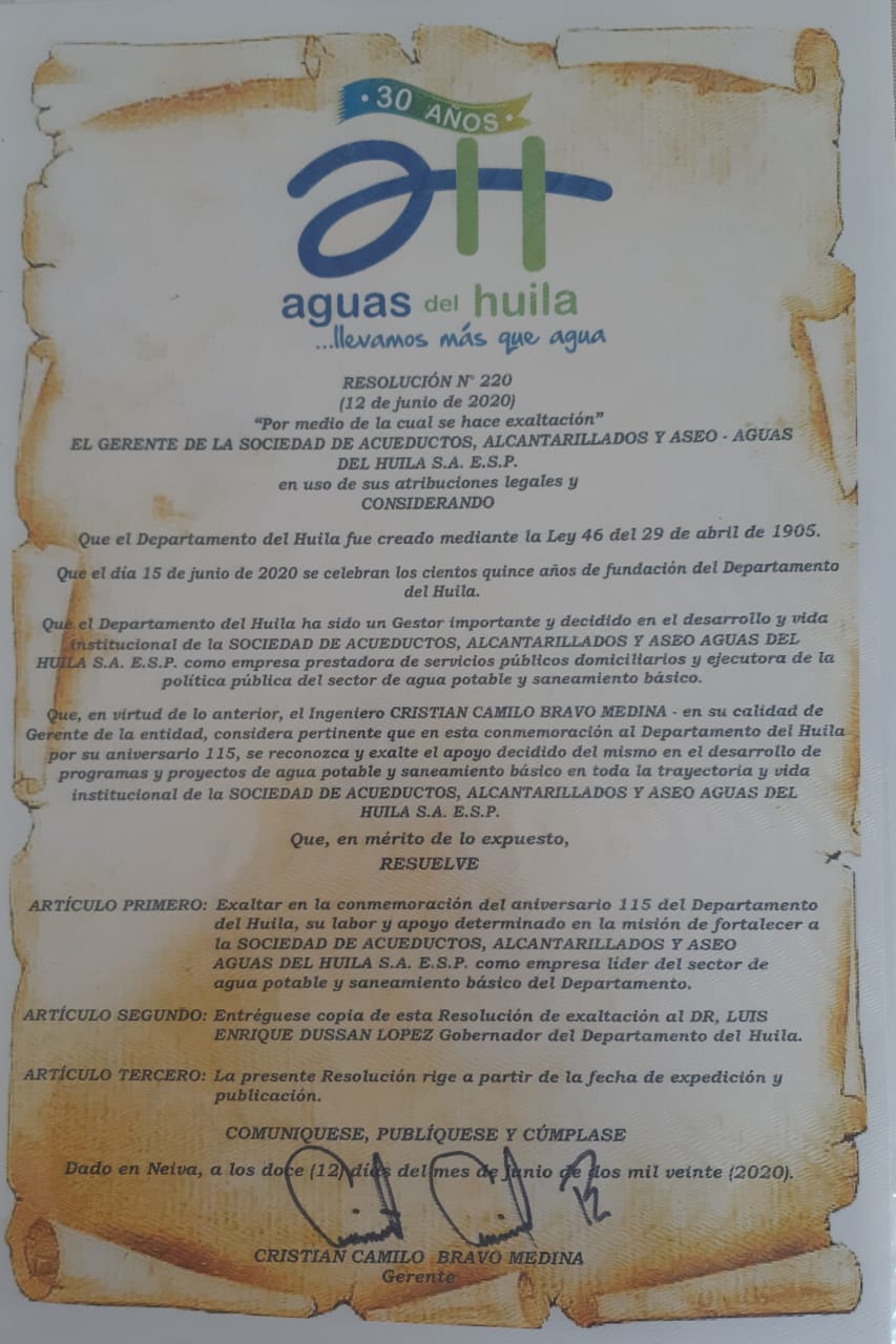 Exaltaci?n por medio de la resoluci?n No. 220 del 12 de junio del 2020 al Departamento del Huila en sus 115 a?os de fundaci?n por su labor y apoyo determinado en la misi?n de fortalecer a la SOCIEDAD DE ACUEDUCTOS, ALCANTARILLADOS Y ASEO AGUAS DEL HUILA S.A. E.S.P. como empresa l?der del sector de agua potable y saneamiento b?sico del Departamento.