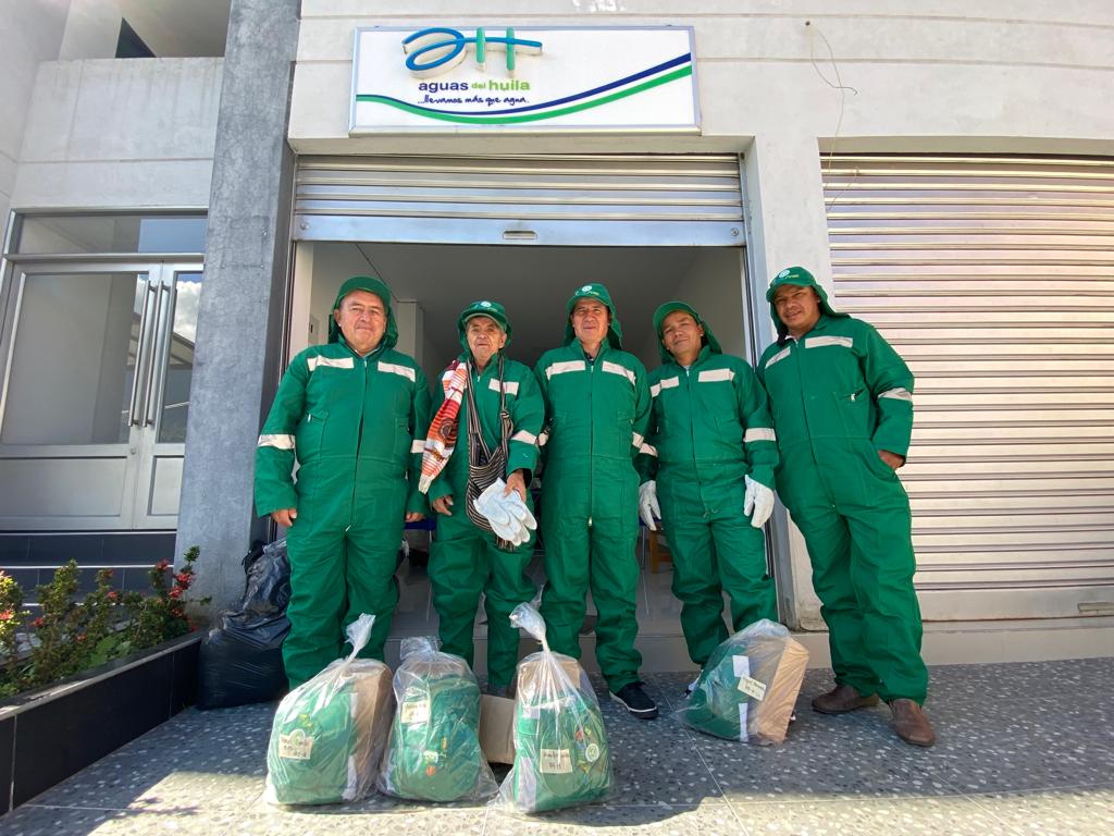 A trav?s de Aguas del Huila, el Gobierno Departamental entreg? un kit de seguridad laboral, integrado por overol, botas, gafas, guantes y gorra, como apoyo la importante labor que desempe?an ?stos hombres y mujeres huilenses, cumpliendo un papel fundamental en la cadena de aprovechamiento de residuos y por ende tambi?n en el cuidado del medio ambiente.